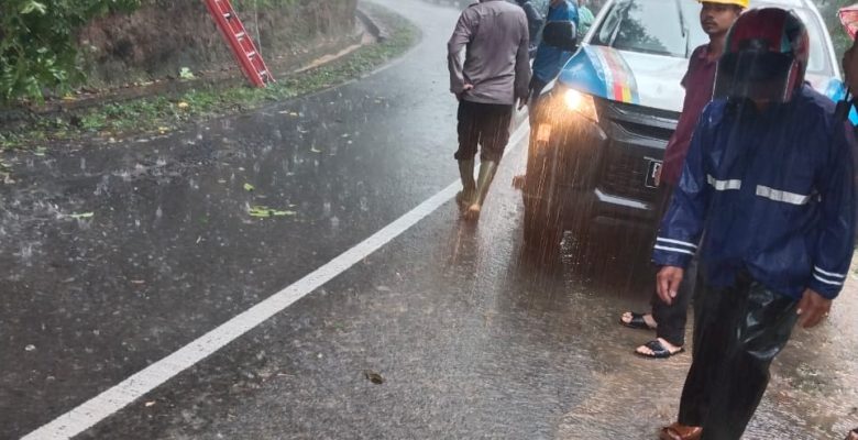 Selain menutup akses jalan, satu unit tiang listrik juga ikut tumbang, sehingga menimbulkan potensi bahaya bagi pengguna jalan.