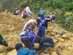 Polsek Cisurupan Bersama TNI dan Warga Evakuasi Material Longsor di Kawah Gunung Papandayan